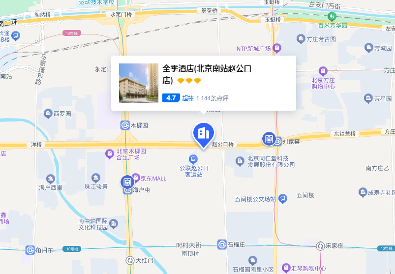 【位置】酒店位于北京市丰台区南三环赵公口甲13号2号楼。 【火车站、机场】距离北京南站车程约10分钟;距离首都机场车程约40分钟。距离大兴新机场车程约45分钟。 【交通】距离地铁5号线刘家窑站和地铁8号线木樨园站步行仅需10分钟。酒店门前公交沿线:2路、120路、93路等公交车可直达前门等繁华商业街。 【周边景点】酒店距离天坛公园车程5分钟;距离天安门、故宫车程约15分钟。 【医院】距离同仁堂分院步行5分钟,距离协和医院车程约20分钟。 【周边学校】距离首都医科大学车程约8分钟。 【周边配套】酒店周边配有大型购物广场(百荣购物中心、合生汇广场、电影院、大型餐饮店)步行仅需5分钟。距离北京有名的全聚德烤鸭店车程约10分钟。【设施】酒店配有独立院落,告别交通喧闹,设有停车场。