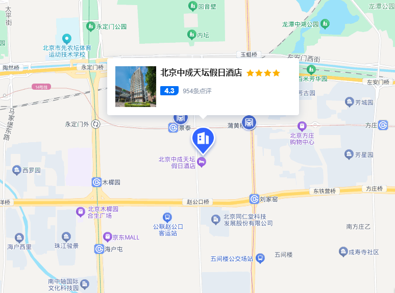 酒店地处南二环与南三环之间,紧邻方庄美食街、著名商业街王府井等地,步行约10分钟即可到达地铁5号线蒲黄榆站或地铁14号线景泰站,酒店距离天坛公园步行约15分钟,酒店距离北京南站15分钟车程,乘坐地铁14号线仅需两站地。距北京首都机场车程约40分钟,距大兴机场车程约45分钟。