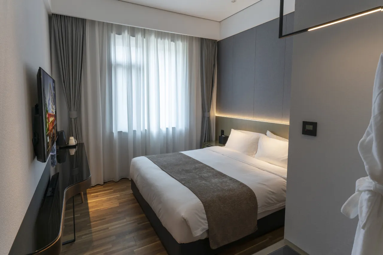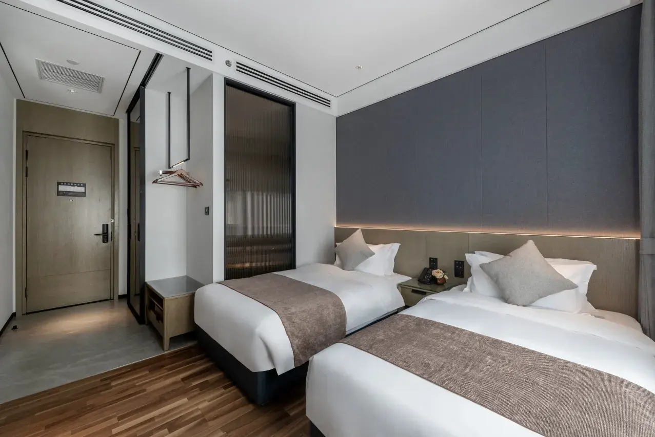 酒店客房使用高档乳胶床品,温馨舒适,同时还设有会议室、商务中心、大堂吧、中餐厅、SPA足疗等配套设施,无论是旅游度假,还是商务差旅,皆可满足宾客多层次的需求。